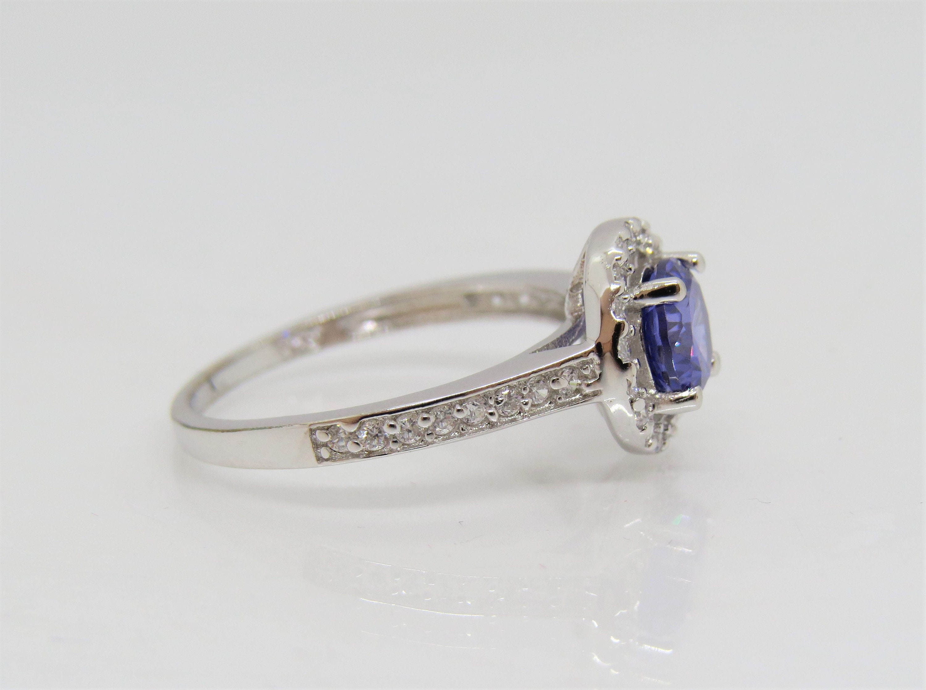 Vintage Sterling Silver Lab Tanzanite & White Topaz Ring....Marked 925...Total of weights 2.2grams... Size 7...Measure of stone center 6.3MM ( 1ct )...It's in very good condition.