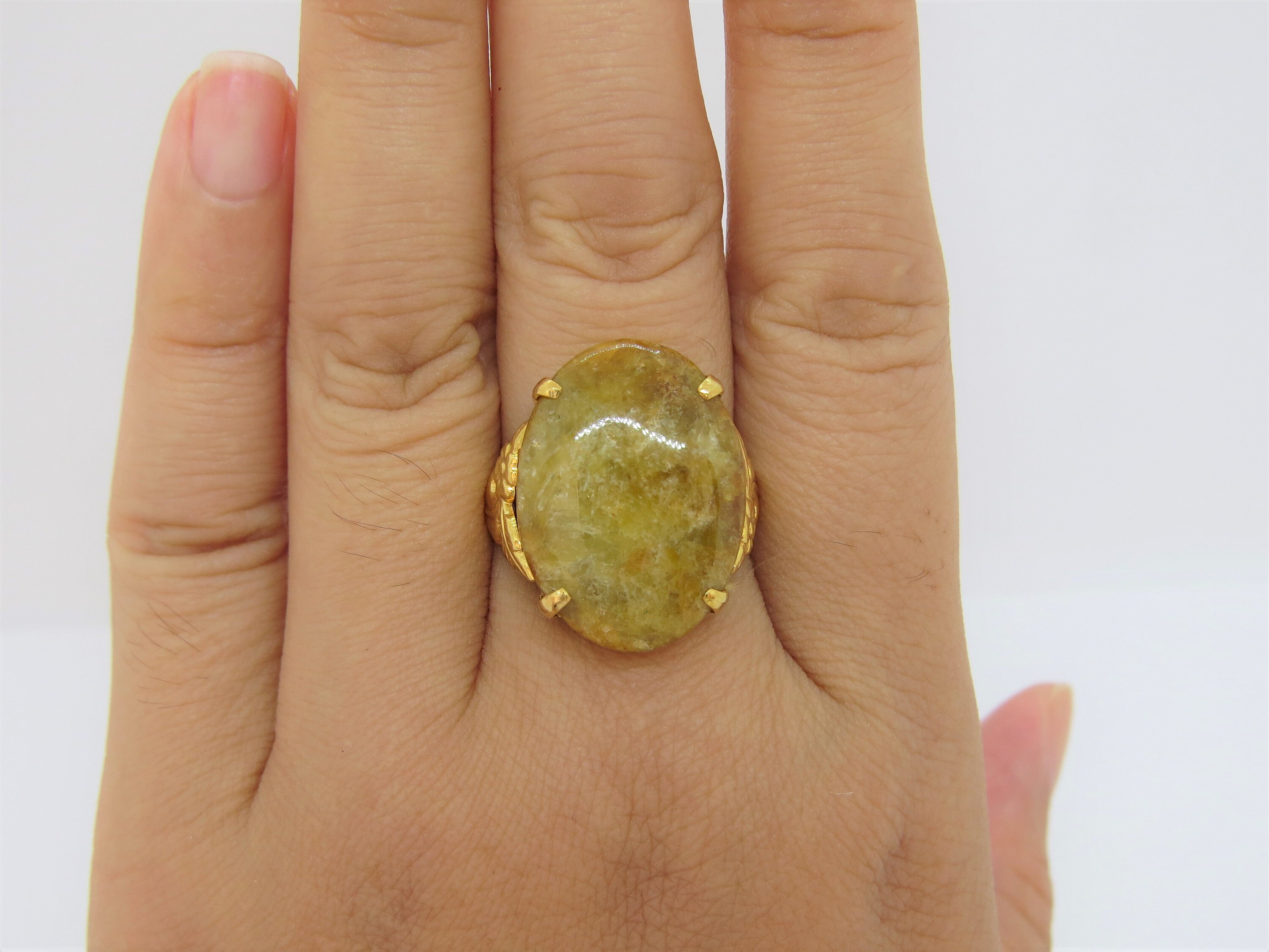 Vintage 18K Solid Yellow Gold Oval Yellow, Brown Jadeite Jade Ring ....Marked 18K...Total of weights 5.8grams...Size 8....Measure of Face 21.4MM...It's in very good condition.