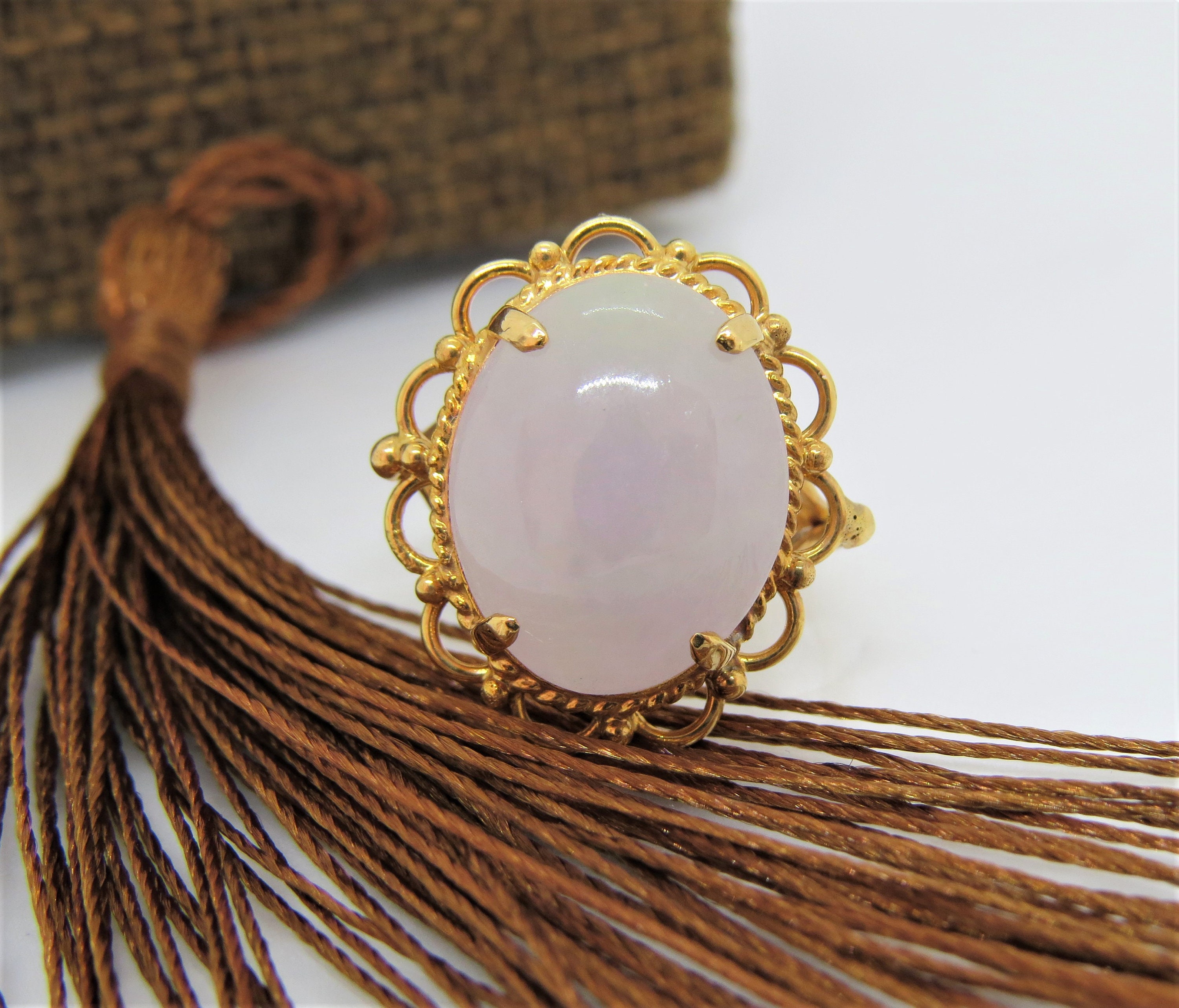 Vintage 18K Solid Yellow Gold Oval Natural Lavender Jadeite Jade Ring....Marked 18k ...Total of weights 5.1grams...Size 7...Measure of Jade 15.5 x 12MM......It's in very good condition.