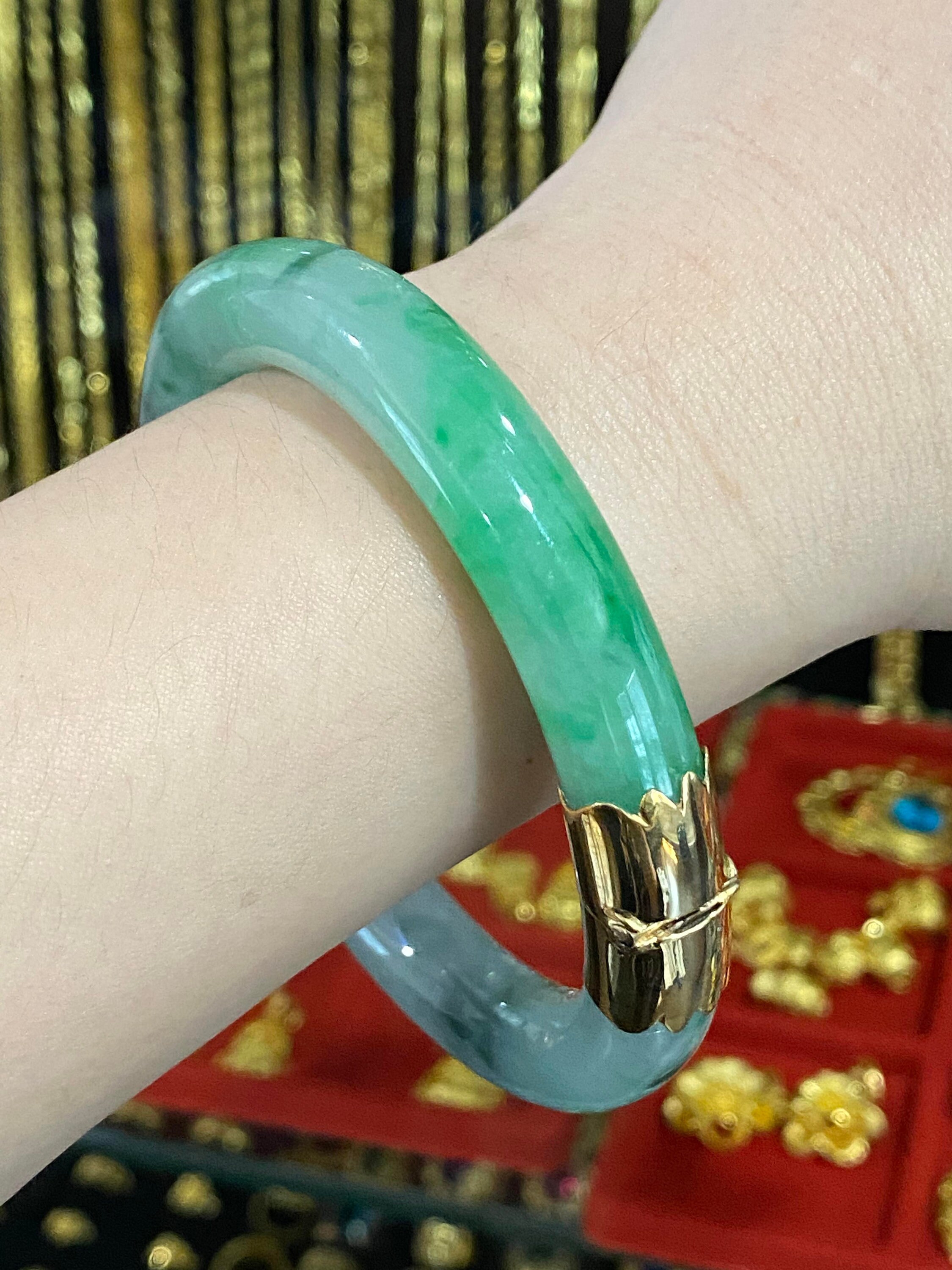 Vintage 18K Solid Yellow Gold Translucent Green, White Jadeite Jade Hinged Bangle Bracelet...Marked 18K.....Total of weights 73.3grams...Measure Inside 58.5MM ( 2 3/8'' inches ) W 11.4MM....It's in very good condition.