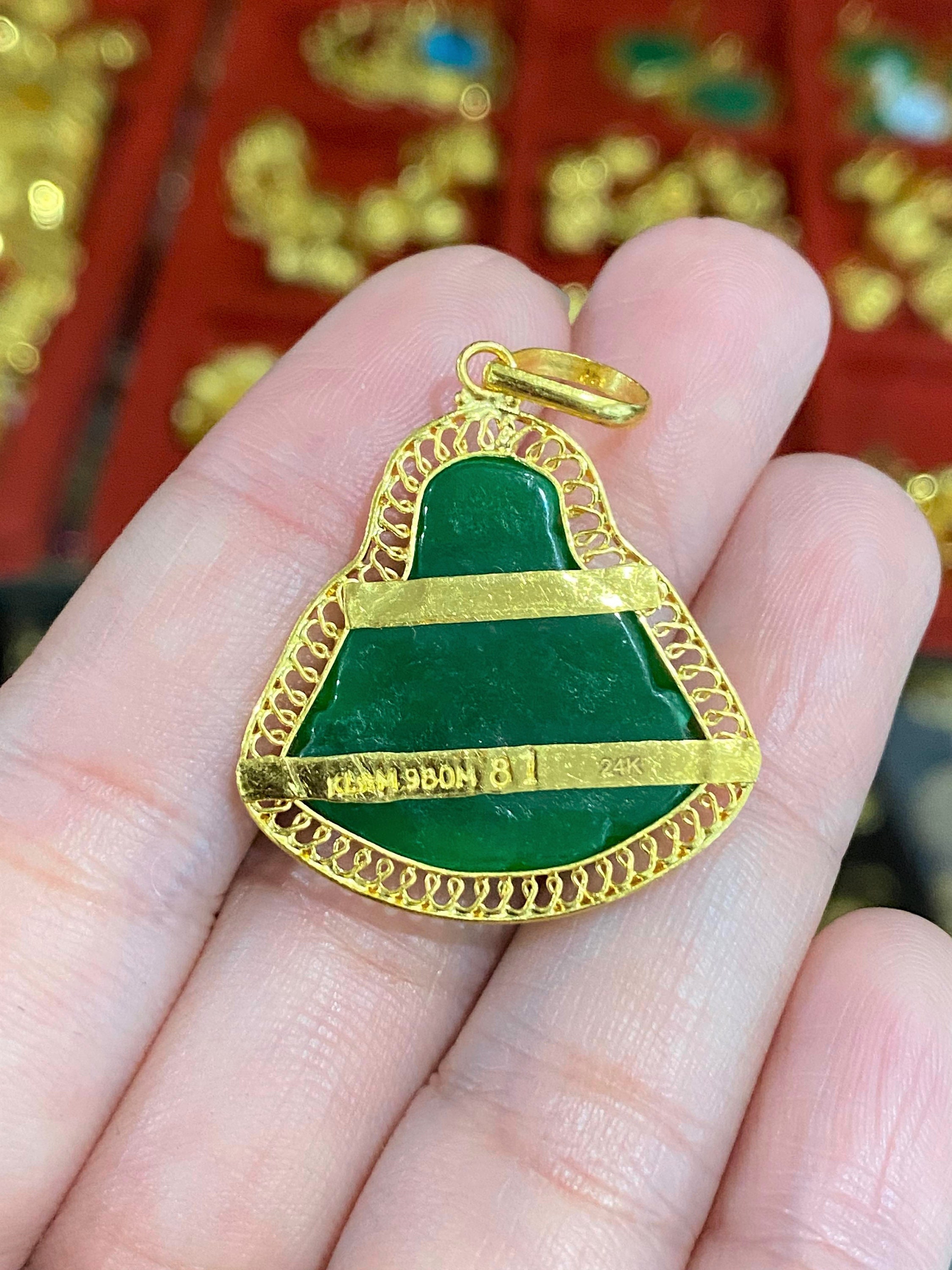 Vintage 24K 980 Solid Gold Green Jadeite Jade Laughing Buddha, Happy Buddha Pendant.