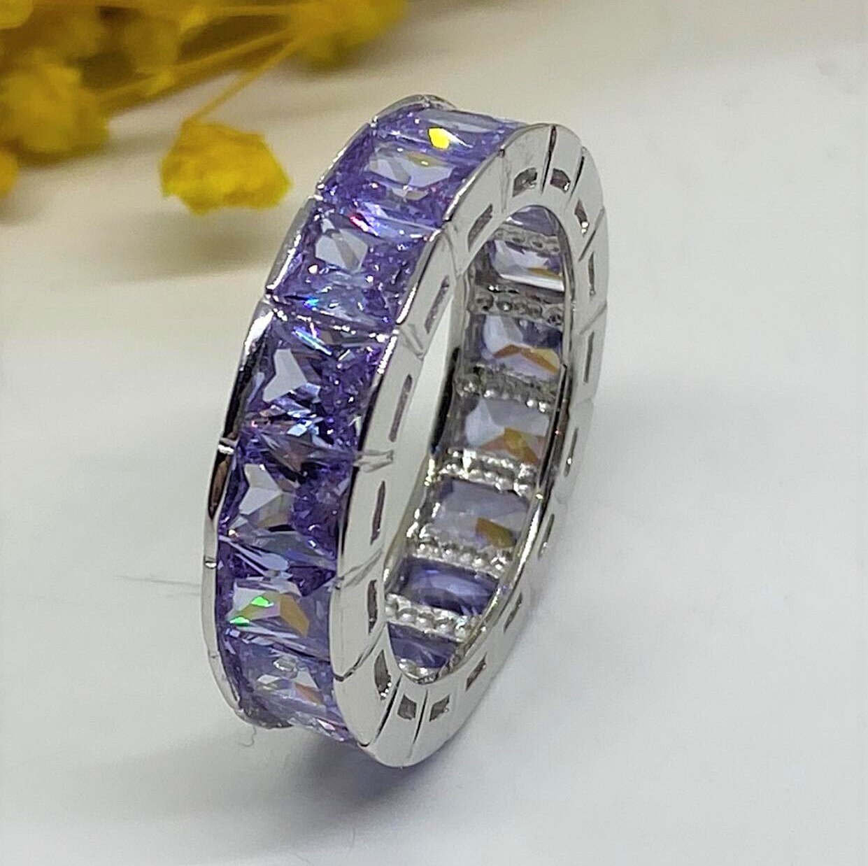 Vintage Sterling Silver Amethyst Band Ring ...Marked 925...Total of weights 5.1grams......Measure of Band 5.7MM...It's in very good condition.