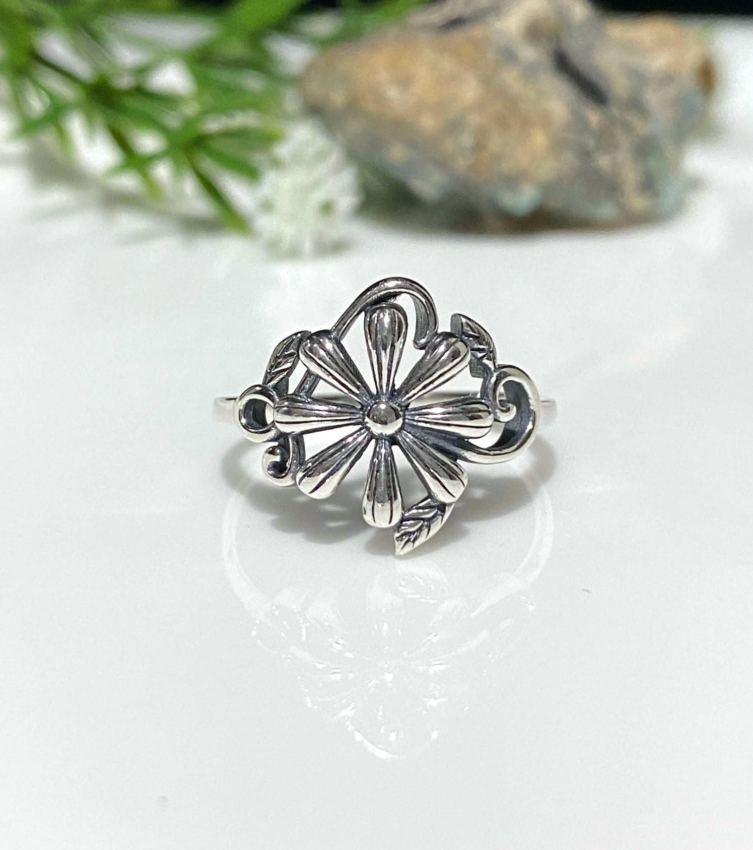 Vintage Sterling Silver Flower Ring....Marked 925...Total of weights 2.5grams... Size 6,7,8,9,....Measure of face 15MM...It's in very good condition.