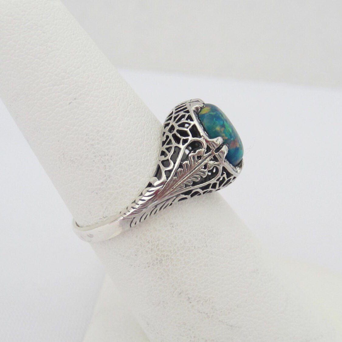 Vintage Sterling Silver Oval Black Opal Filigree Ring ...Marked 925...Total of weights 2.4grams..Size 9..Measure of Face 11.6MM...It's in good condition.