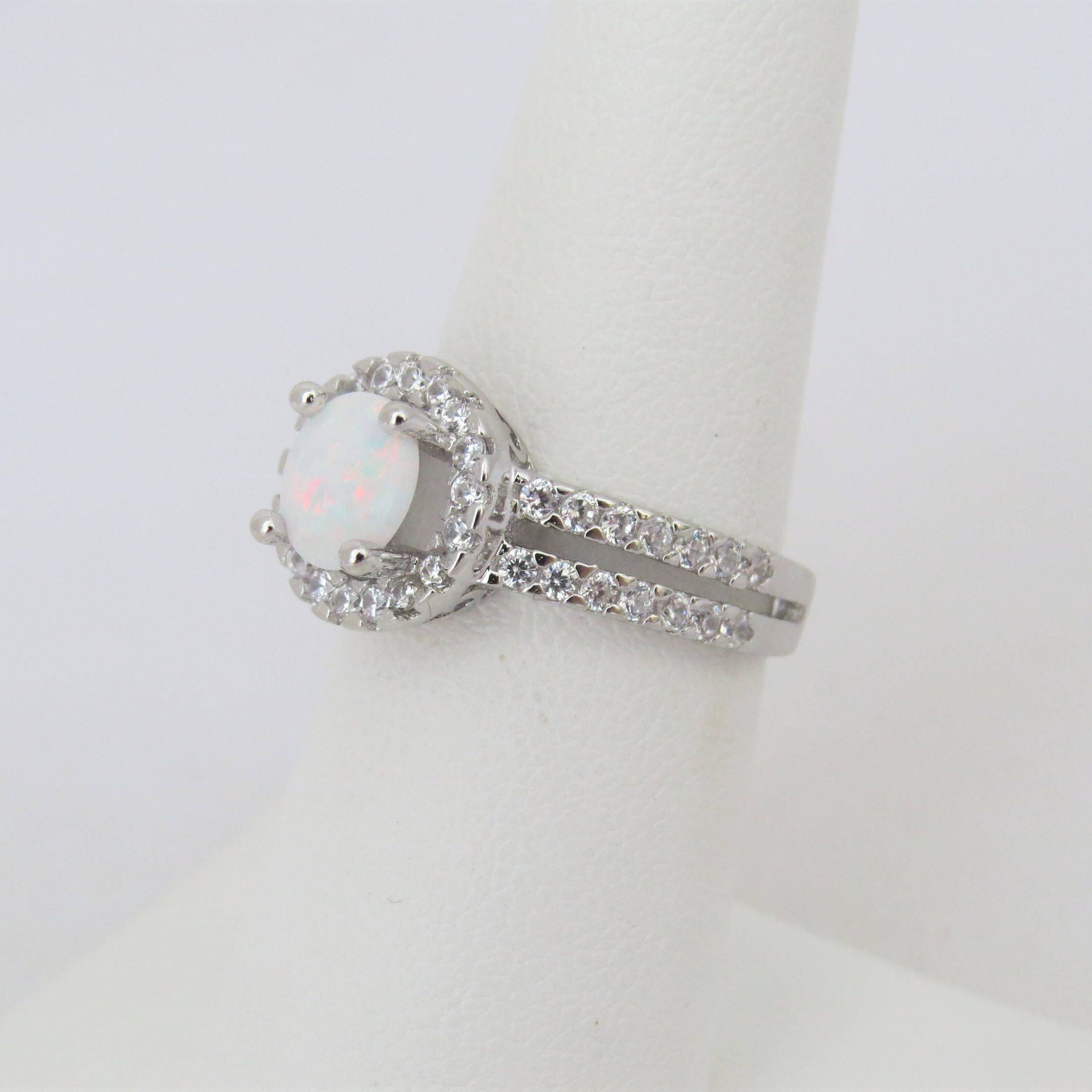 Vintage Sterling Silver White Opal & White Topaz Halo Engagement Ring Size 7