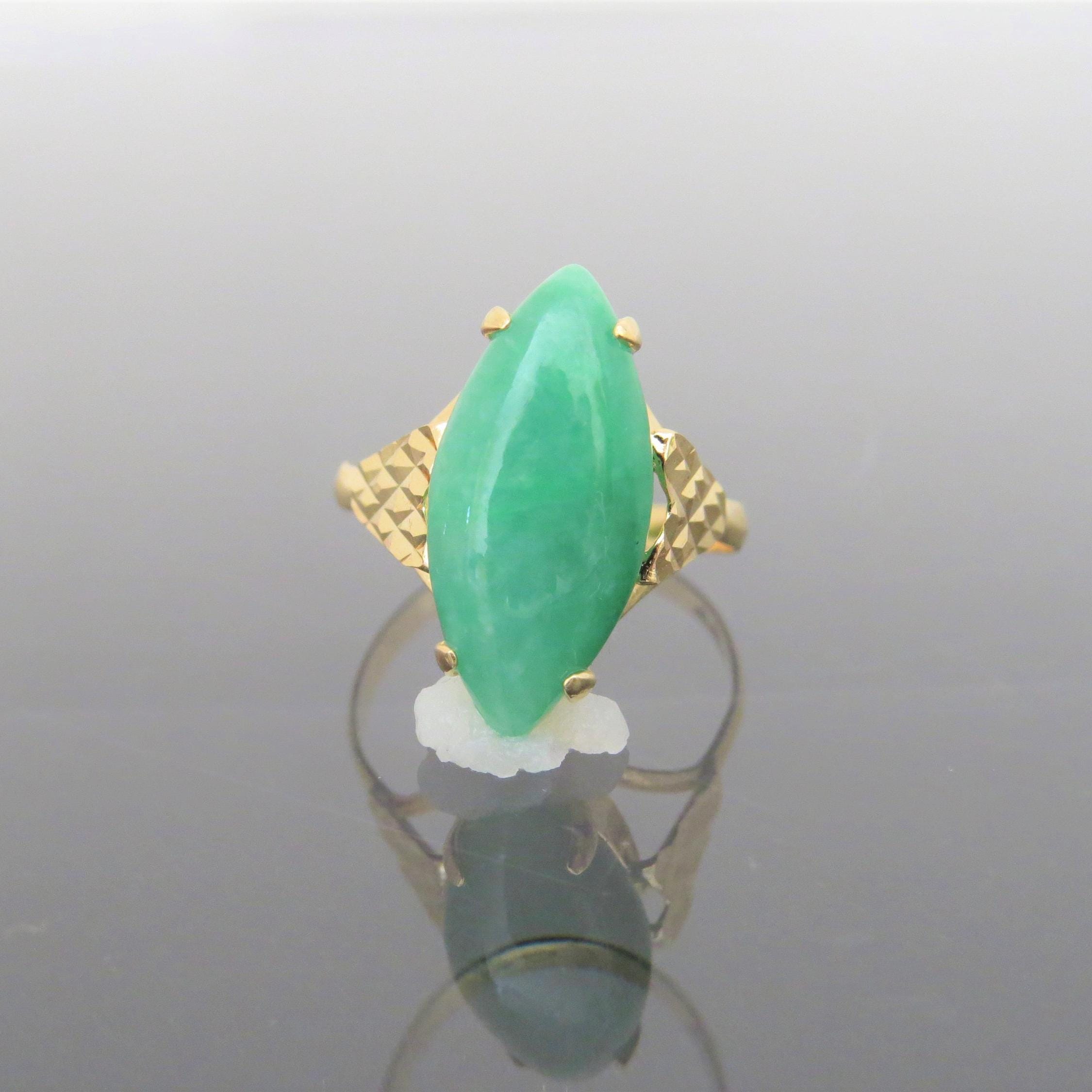 Vintage 18K Solid Yellow Gold Natural Green Jadeite Jade Ring ...Marked 18K ..Total of weights 2.9grams...Size 6...Measure of Jade 17.5 x 8MM...It's in very good condition.