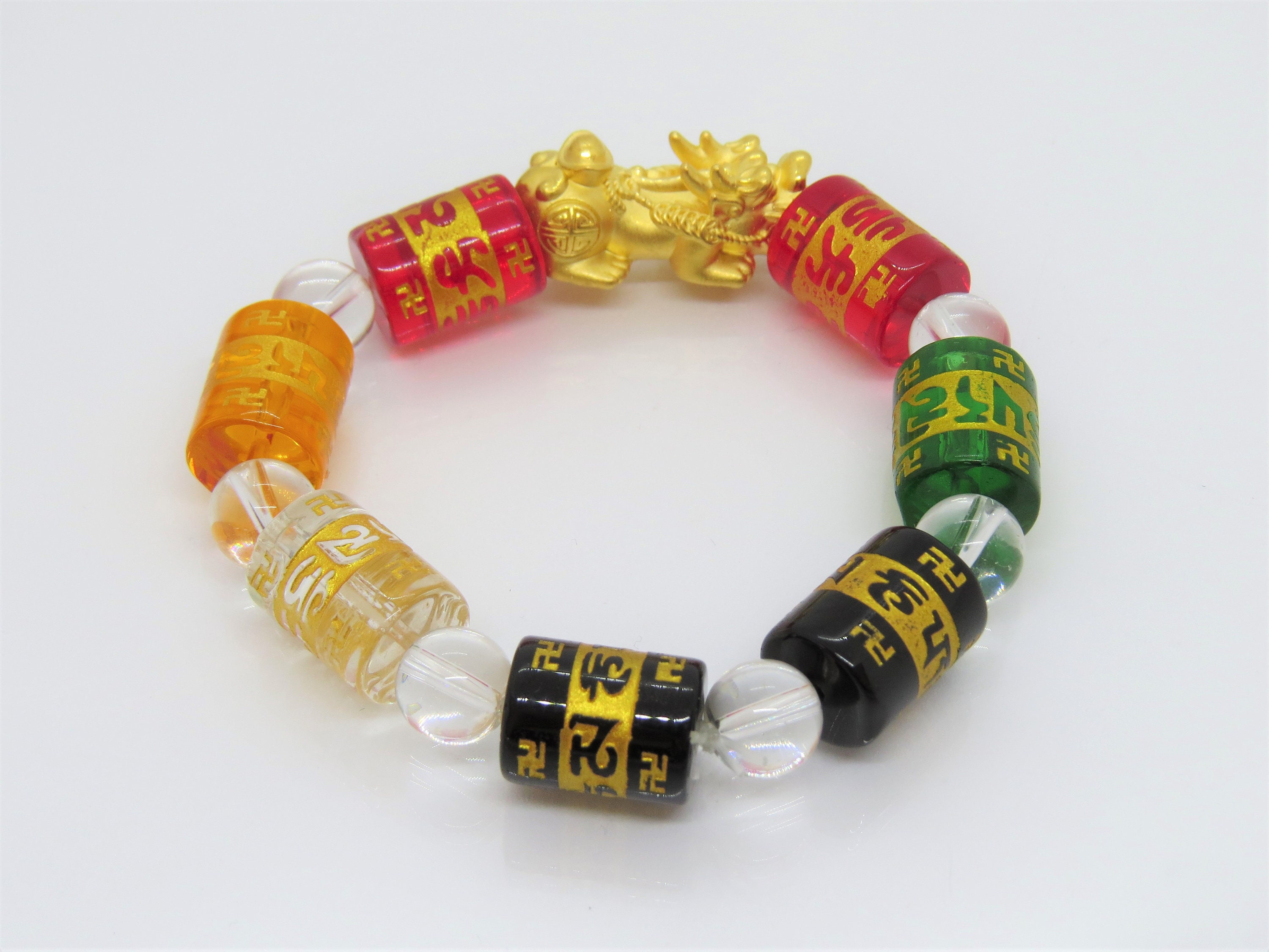 Vintage 24K 9999 Yellow Gold 3D Pixiu with Multi Color Gemstone Carved Bead Elastic Bracelet ....Marked 9999 ...Total of weights 40.8grams...With 7 Beads 15 x 12MM and 6 White stone beads 9.5MM...Measure of Pixiu 28MM x 13MM...It's in very good condition.