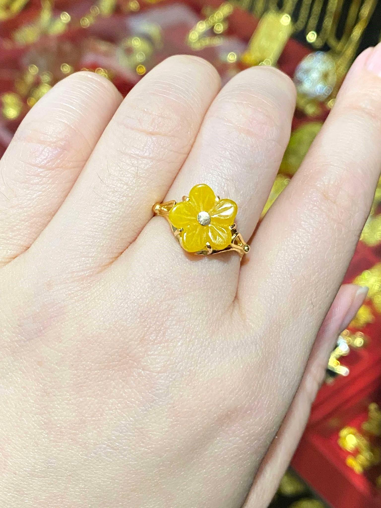 Vintage 14K Solid Yellow Gold Yellow Jadeite Jade Flower Ring...Marked 14K...Total of weights 2.4grams...Measure Of Face 12.2MM ...It's in very good condition.