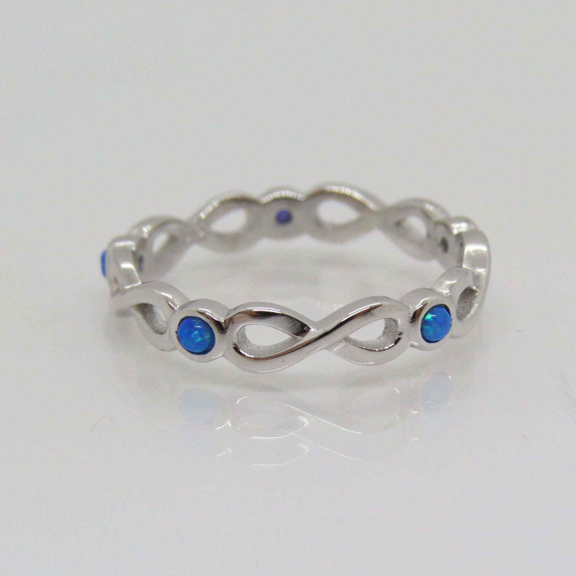 Sterling Silver Blue Opal Infinity Band Ring....Marked 925...Total of weights 1.8grams... Size 8...Measure of Band 2.6MM...It's in very good condition.