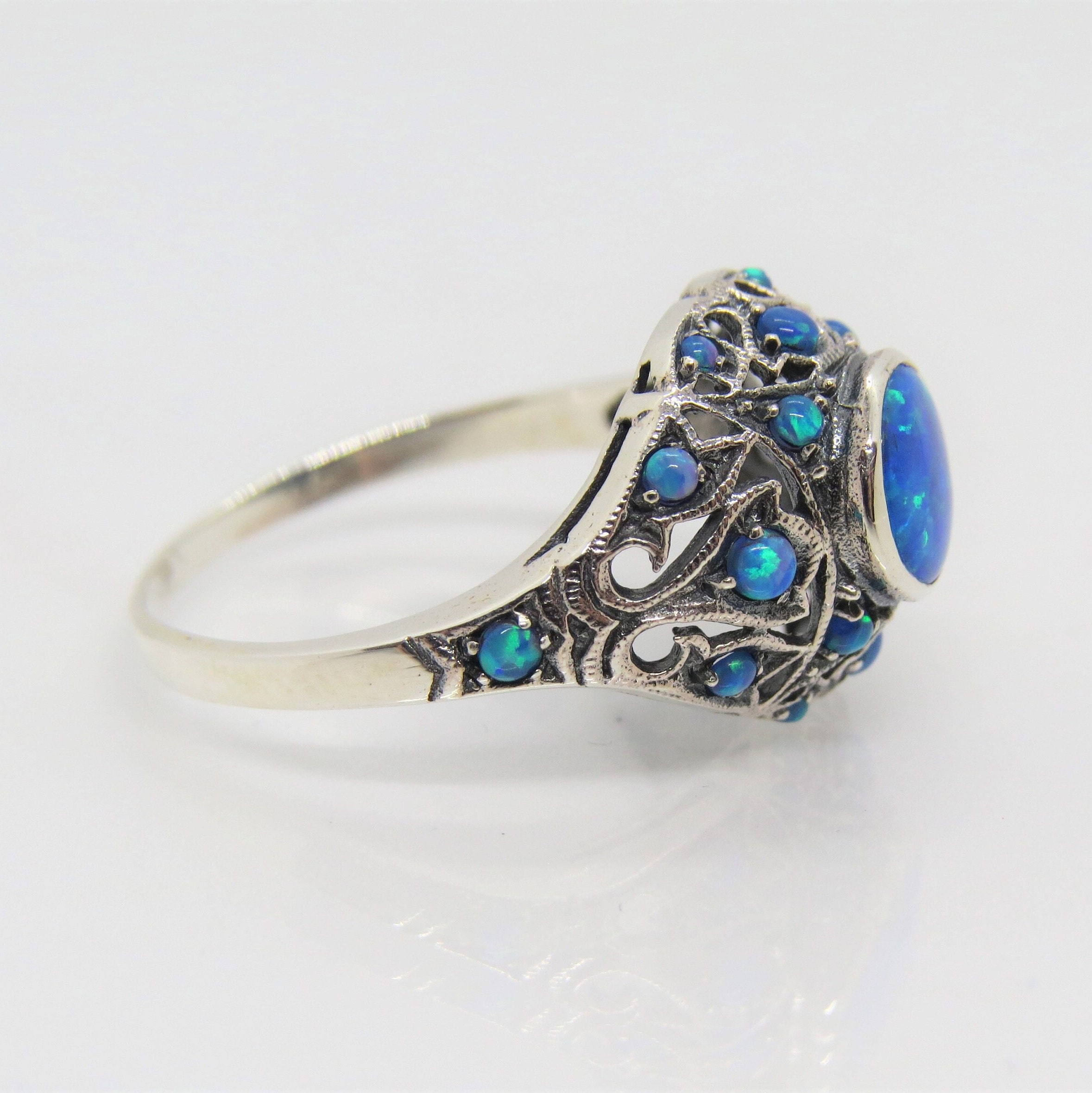 Vintage Sterling Silver Blue Opal Filigree Dome Ring ....Marked 925...Total of weights 2.3grams...Size 8...Measure of Face 12.6MM...It's in very good condition.